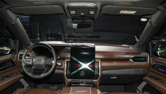 进入车内能够感受到美系车扎实的用料,中控台以及车门内饰板都用真皮和实木进行包裹,营造出豪华车的氛围感,中控部分搭载一块16.8英寸的大屏幕,支持手机互联和导航功能,另外,育空采用7座布局设计,对于全尺寸SUV来说,在7座布局状态下车内的空间也很宽敞,能够满足家用的需求。